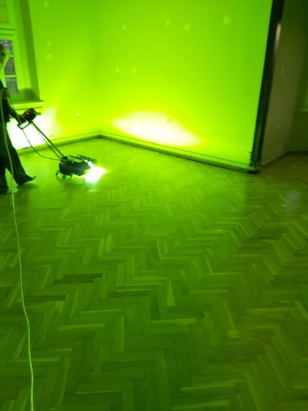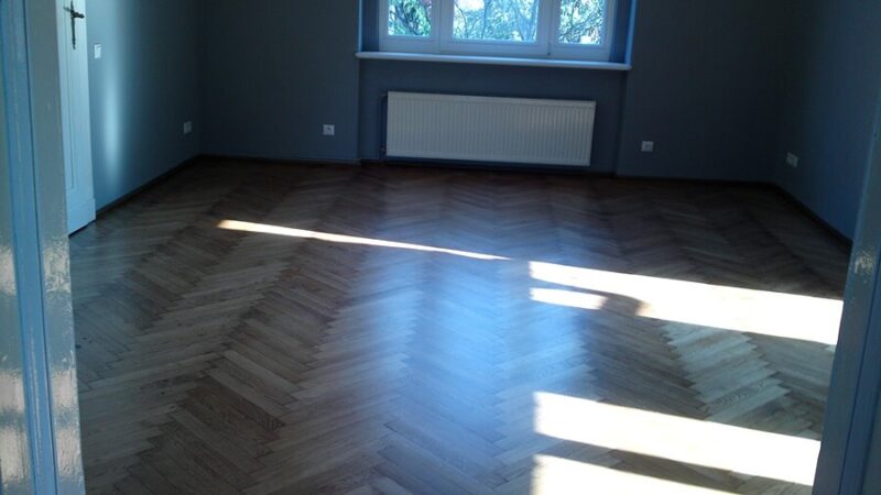 Cyklinowanie i lakierowanie parkietu dębowego ułożonego we wzór jodełka.